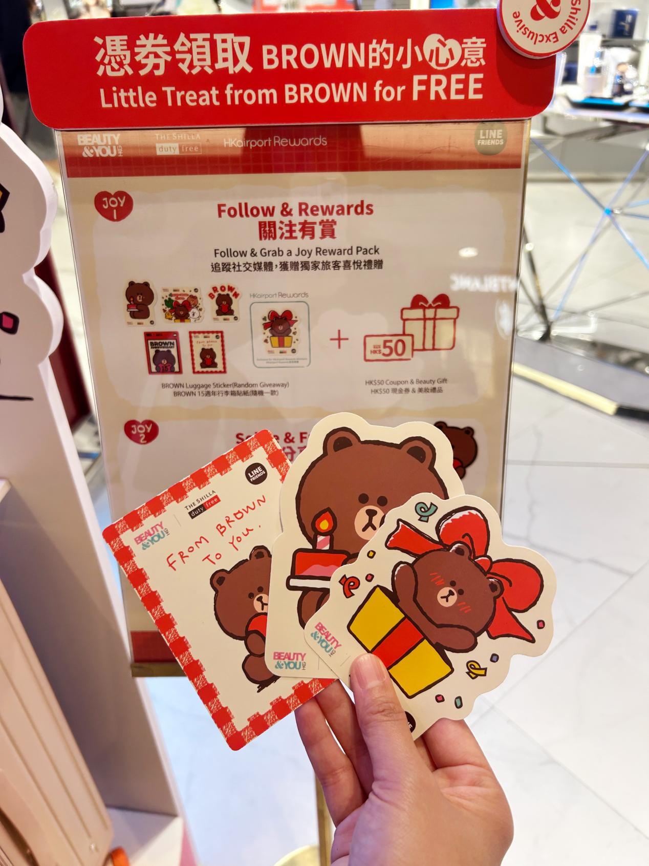 本次联名活动准备了多样的互动礼遇,旅客只要关注Beauty&You任意官方社交平台,或是订阅店铺电子报,就能领取LINE FRIENDS 15周年特别版行李箱贴纸,贴纸共有五款样式,每人限领一款,同时还可获得包含港币$50现金券与美妆礼品兑换券的礼赠组合。